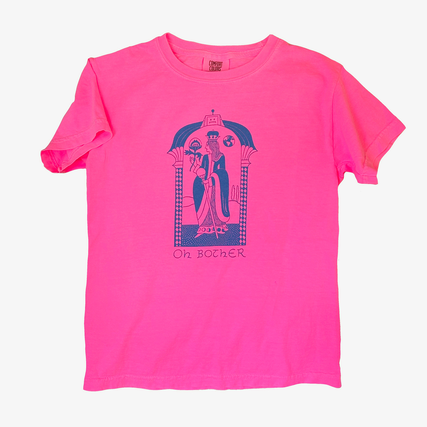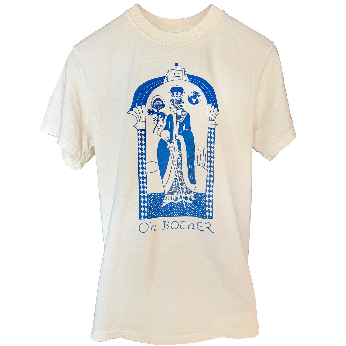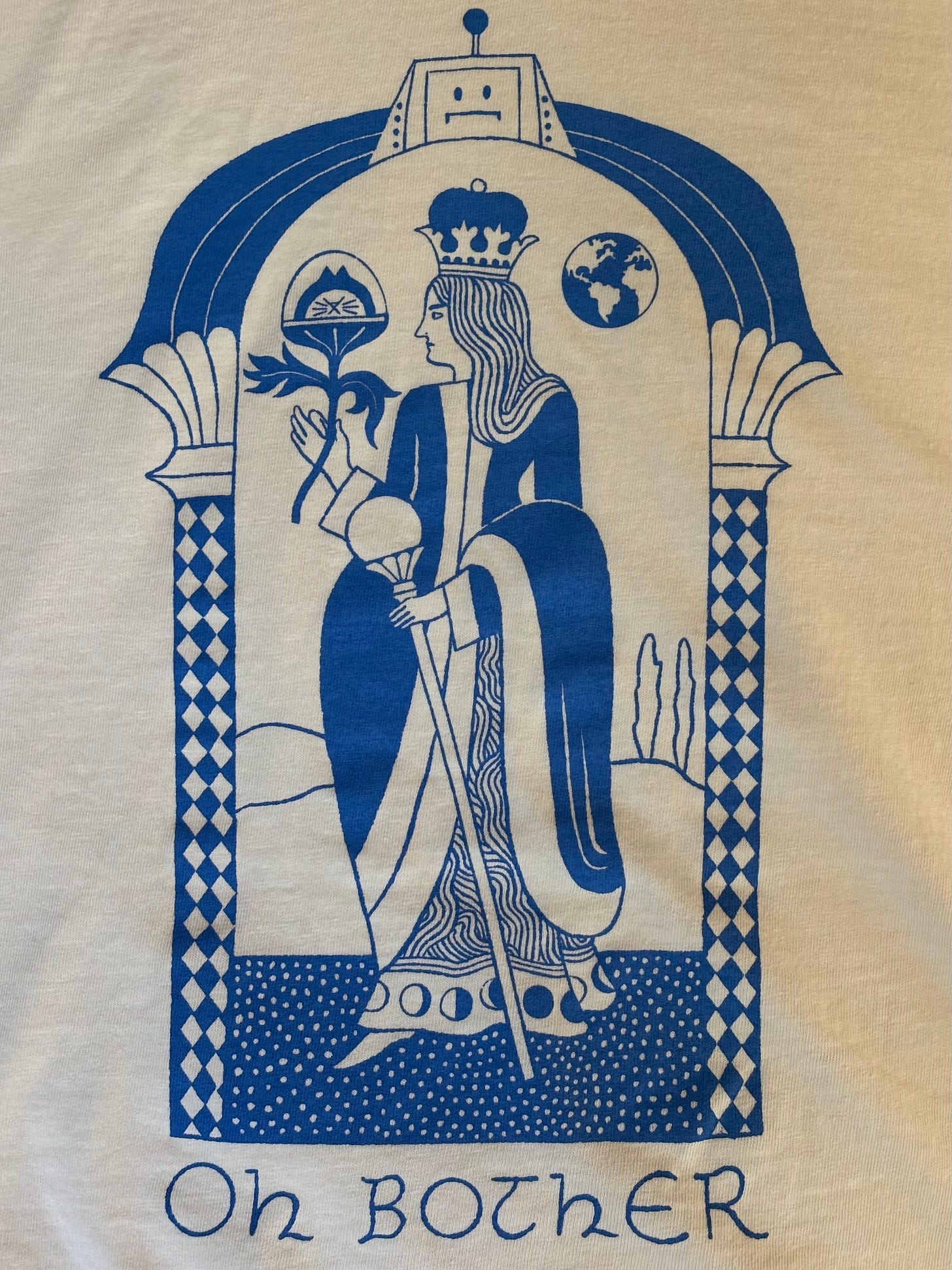 It features Carson’s rendition of the Moon Queen (look closely and you’ll see she drew LOZ 4000 and First Cat too) and the Moon Queen’s catchphrase, “Oh Bother,” in Carson’s elegant hand. They’re printed on Comfort Colors blanks by Black Stamp Studios in Half Moon Bay, CA. The adult are shirts on ivory, youth shirts on electric pink. What a shirt!